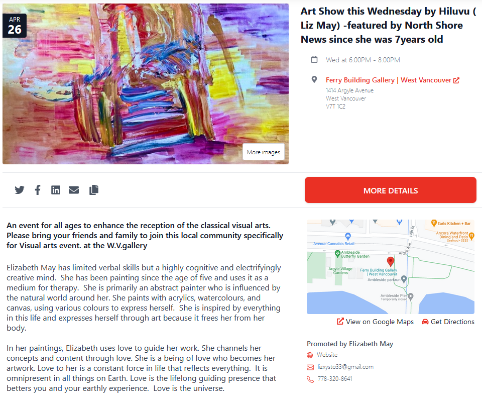 Approximately 20 of Elizabeth's paintings will go on display at Bel Art Gallery, 3053 Highland Blvd., North Vancouver, between Friday, Jan. 11 and Feb. 2, in an exhibit titled Art from Autism. There will be an opening children's day between 11 a.m. and 1 p.m. on Saturday, Jan. 12. The work is likely to be auctioned off at the end of the display.