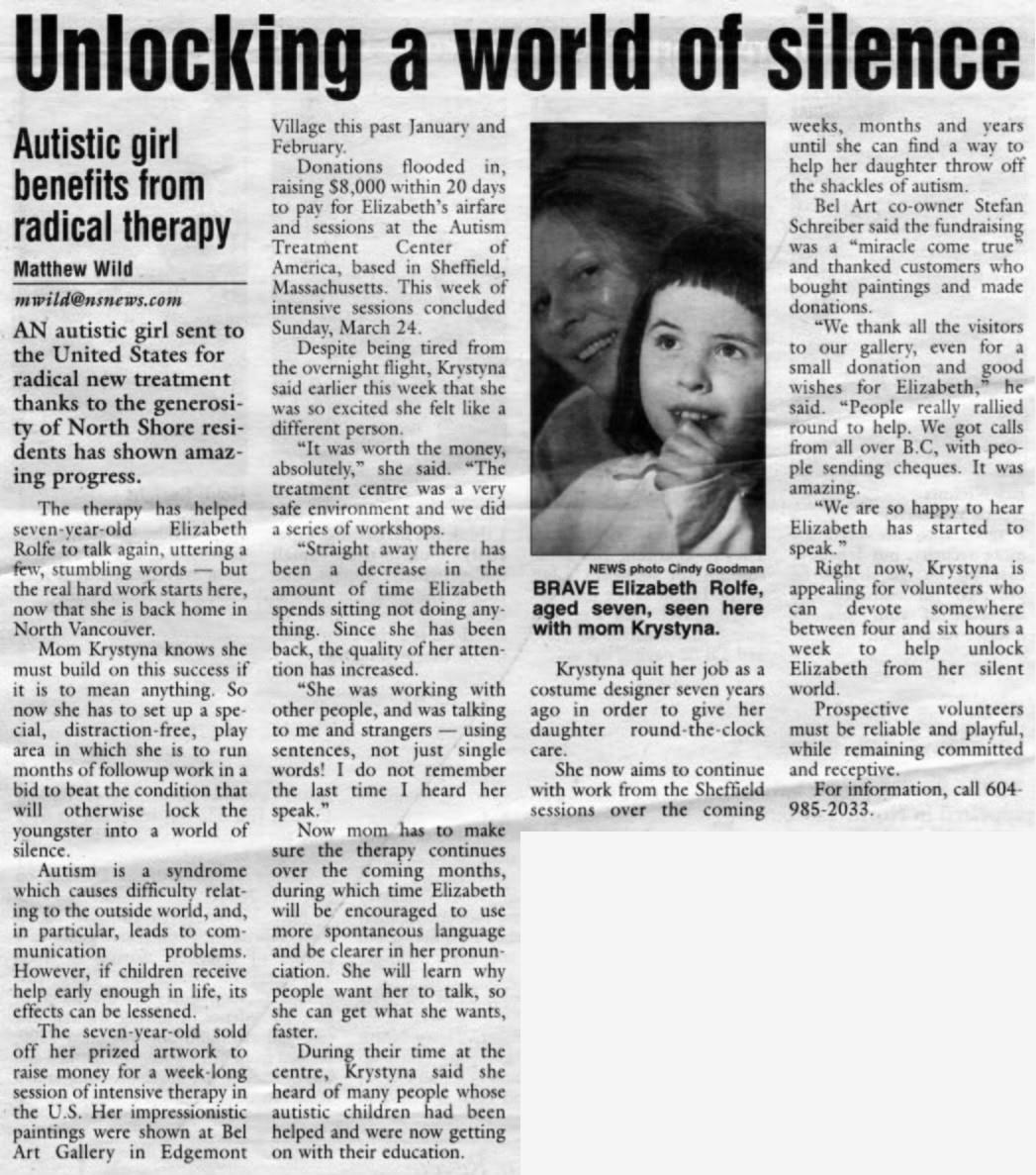 Said Rolfe, "Elizabeth was diagnosed autistic when she was four, but we have not had any follow-up work since then, with no treatment offered. The government gives no money for autistic children.